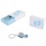 El llavero tiene la forma del bebe durmiendo y va metido en una caja con la huella de unos pies en color azul.